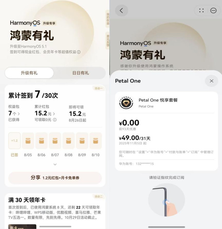 最后我还提醒他,这个手机已经升级到鸿蒙5.1了,记得每天去负一屏的“鸿蒙有礼”签个到——说不定就能抽到Petal One悦享套餐,这个套餐中包含了三个月200GB的华为云空间,特别适合他这种资料多的学生党。另外签到第30天还能领取“年卡免单券”,兑换WPS等学生党必备的应用会员,非常实用。除了抽取权益,在开学季期间,订阅华为云空间套餐也有机会享受专属优惠,在手机里直接点击“设置”进入华为云空间,就能找到专属优惠。