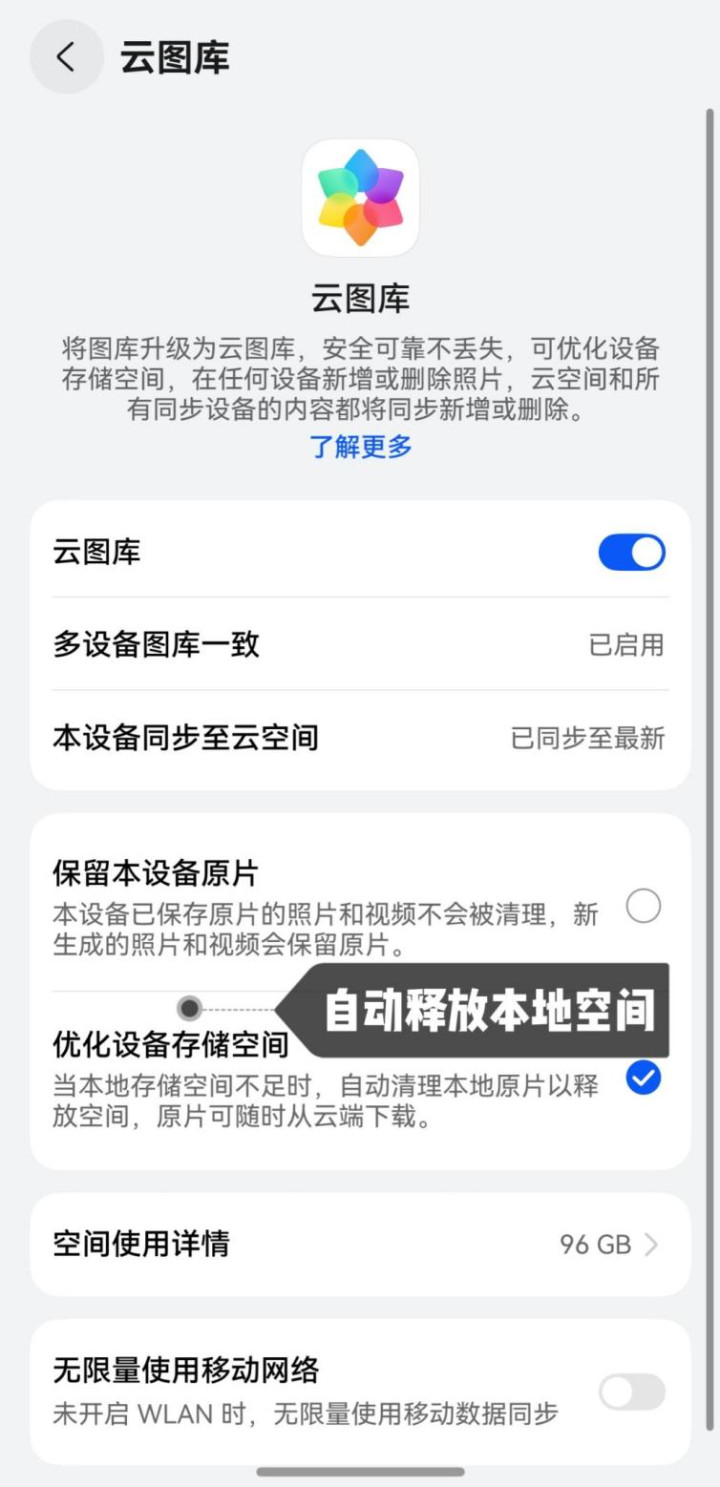 他之前总抱怨128GB的手机还没用多久就满了,我就教他开启“优化设备存储空间”,系统会自动把不太常用的照片和视频替换成小尺寸的预览图,原文件都安安稳稳地放在云上,要用的时候随时能下载。这样手机就可以自动地腾出好多空间,也不怕手机突然提示“存储空间不足”,也不用隔三差五删照片了。